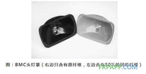 回收的纖維最直接的再利用是以不連續纖維形式(如模壓料或表面紗)為基礎的半成品材料。從回收的纖維的含量高達50%的樣品觀察來看,其拉伸、彈性及沖擊性能均沒有顯著影響。但是,若替代品超過50%,拉伸、彈性及Charpy沖擊強度都顯著下降。由上述單纖維測試發現,回收纖維的含量不影響模量。作為輕質替代品如汽車頭燈外殼和儀表板等,為其提供了商業應用的光明前景。一些技術人員正在研究基于專用DMC組分配方的小型頭燈的制造(如圖所示),其組分為不飽和聚酯樹脂,Al(OH)3填料和重18%的無堿玻纖(50%6mm原始短切纖維束和50%這種工藝回收的纖維)。BMC用普通方法制造,必須組分配方和工藝沒有變化。含有回收的纖維的組分配方與常規混合物沒有不同,模塑部分產生表面涂層(表面處理劑)適合鍍銀金。用回收纖維制的BMC機械性質與控制的沒有顯著不同,盡管沖擊強度稍有下降,但電性能沒有改變。