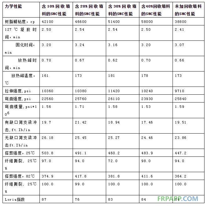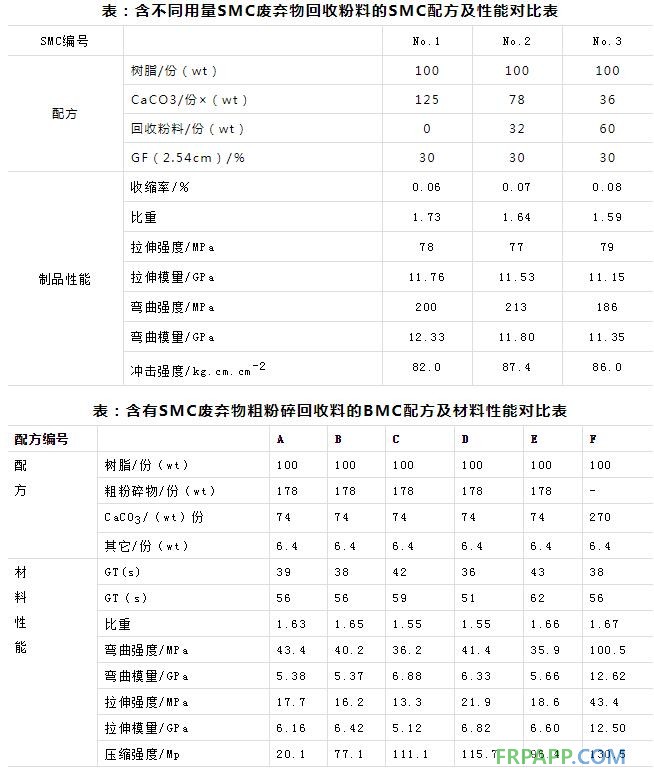 SMC廢棄物回收粉料用于BMC、SMC材料性能見以下兩表。從中可以看出:回收料在BMC和SMC中用量分別達到50%和30%時,對材料的機械性能影響不大,但卻使材料比重下降較大,可制得輕質產品