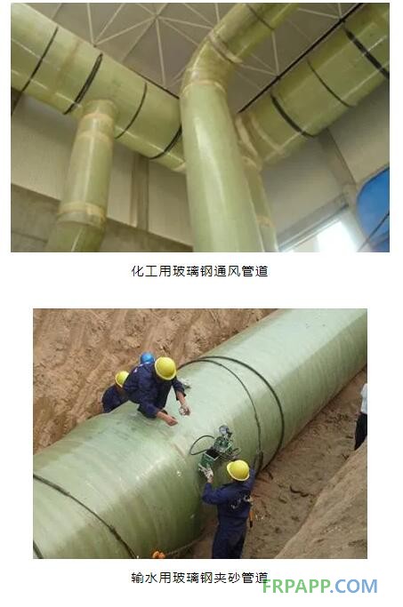 纖維纏繞管道制品因其強度高、整體性好、綜合性能優(yōu)異、容易實現(xiàn)高效的工業(yè)化生產(chǎn),綜合運營成本較低而被廣泛地應(yīng)用于煉油廠管道、石油化工防腐管道、輸水管道、天然氣管道和固體顆粒(如粉煤灰和礦物)輸送管道等方面,如圖下圖所示。