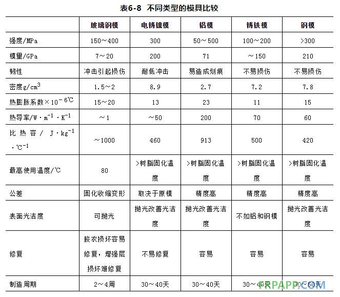RTM是在低壓下成型,模具剛度相對要求低,可以使用多種材料來制造模具。常用的模具類型有玻璃鋼模具,電鑄鎳模具、鋁模具、鑄鐵模具和鋼模。表6-8列出了各種類型模具的比較。