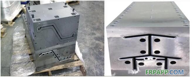 1、多向纖維聚氨酯拉擠制品 注膠盒結構為中高壓注膠,多向纖維先通過冷模(冷模型腔尺寸與產品型腔尺寸相當)定型紗線與氈后再進入一定空間的注膠盒,在注膠盒內經過高壓注射將樹脂與纖維結合,纖維與樹脂結合在通過正確的模具型腔,通過溫區定型,拉擠出成品的一種工藝方法,該模具在設計過程中模具廠家應依據制品厚度和結構對模具冷模注膠盒進行適當放量和斜度以及樹脂導流槽。