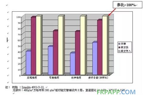 在通常的手糊工藝(hand lay-up)中,增強材料鋪于模具中, 采用刷子,輥子或其它方式手工浸潤增強材料。另外一種改進的方法是使用真空袋吸出手糊時積層中多余的樹脂。這樣提高的玻纖含量,得到更高強度和更輕的產品。VIP 相對于傳統的工藝具有很多優勢,如圖以手糊,真空袋和真空導入為例。在力學性能上真空導入占有明顯的優勢。