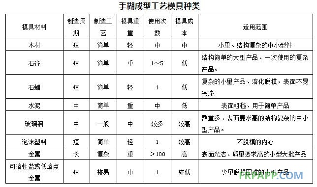該工藝過程:先在模具上涂一層脫模劑,然后將加有固化劑的樹脂混合料刷涂在模具上,再在膠層上鋪放按制品尺寸裁剪的增強材料,用刮刀、毛刷或壓輥迫使樹脂膠液均勻地浸入織物,并排除氣泡。待增強材料被樹脂膠液完全浸透之后,再鋪下一層。反復上述過程直到所需層數,然后進行固化。待制品固化后脫模,并打磨毛刺飛邊,補涂表面缺膠部位,對制品外形進行最后檢驗。