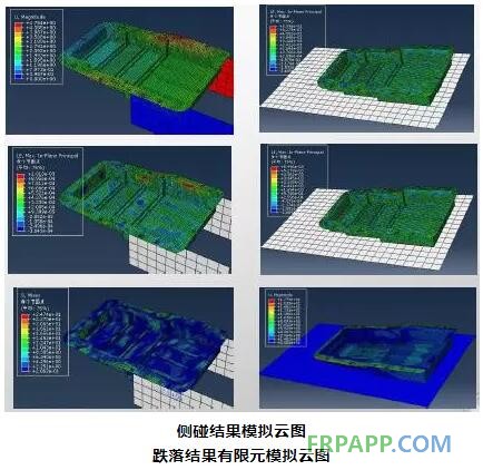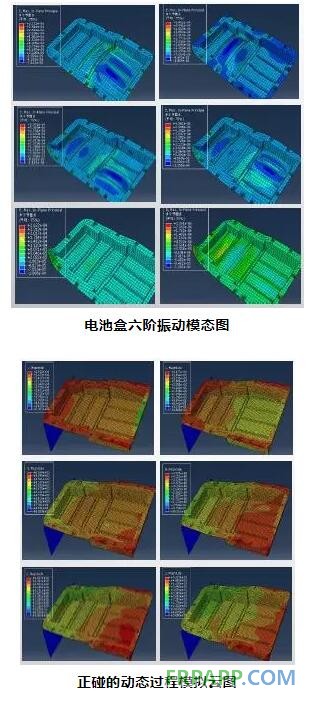 2)確定了動態(tài)校核的內(nèi)容,分別對電池盒進行振動模態(tài)分析,正碰分析,側(cè)碰分析,跌落分析,分析模擬校核結果,確定結構的安全性。