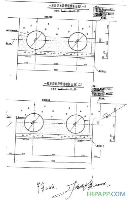 另一種形式為垂直開挖、鋼板樁支護。回填層布置同上。開挖底寬為7700mm。考慮空管抗浮要求,管頂以上同填總厚不小于1500mm.此外也可采取將管拉固在鋼筋混凝土底板之上,以滿足抗浮要求,但管頂以.上覆土厚度仍需大于800mm.