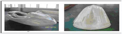 艇身smc模壓常見的缺陷主要包括重量超標或者過小、表面出現裂紋、表面光潔度不夠、表面顏色不均勻且有些部位出現黃色、脫模不順暢有時出現粘模的現象。針對上述情況在試模時的填料在理論計算的基礎上通過工藝試驗驗證的方法進行合理的控制,同時配制樣板在smc板料的基礎上對填料進行控制下料稱重。模具表面溫度通過溫度測量計對多處關鍵點的溫度進行測量,根據溫度分布均勻的需要,對模具加溫和流道等進行合理的設計制造來保證,在設計初期可通過有限元模擬的方法對流道進行傳熱分析模擬優化設計,有效的保證了模壓時模具溫度的均勻一致性。針對模壓后,由于產品取出后為高溫達120o左右狀態,因此對脫模后的產品為保證產品的外形和減小冷卻過程中的變形,通過校形鋪放工裝有效的保證了產品的外觀尺寸精度一致性要求。如下圖所示為艇身模壓出的實物圖,經過裝配粘接與水上試驗,通過smc成型的方式,不僅有效的減輕了整艇的重量,同時有效的保證了產品的密封性、行駛的穩定性和使用強度與疲勞要求,如圖4所示為壓制成型合格后的實物。