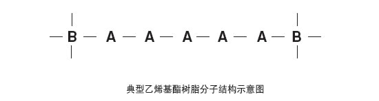 下圖顯示了乙烯基酯樹脂的典型分子結構,表明了酯基和活性基團的位置。