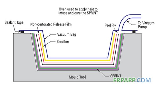 方法描述:較厚結構(>3mm)中使用預浸料很難在固化過程中將層間或重疊鋪層部分的氣泡排出,為了克服這一困難,預抽真空被引入了鋪層工藝,卻顯著增加了工藝時間。近年來,固瑞特推出了一系列具有專利技術的改進型預浸料產品,使高品質(低孔隙率)較厚層合板的制造實現了一步完工藝即可完成。半預浸料SPRINT由兩層干纖維夾一層樹脂膜的夾芯結構組成,材料鋪入模具后,真空泵即可將其中的空氣在樹脂升溫變軟并浸潤纖維前完全抽干,然后再進行固化。梁用預浸料SparPreg是一種改進的預浸料,在真空條件下固化時,可以很容易地將氣泡從粘合的兩層材料間排除。