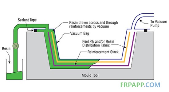 方法描述:將干纖維以類似與RTM工藝中的方式鋪覆,然后鋪上剝離布和導(dǎo)流網(wǎng)。鋪層完成后,用真空袋完全密封,在真空度達(dá)到一定要求時,將樹脂導(dǎo)入整個鋪層結(jié)構(gòu)。樹脂在層合板中的分布依靠導(dǎo)流網(wǎng)引導(dǎo)樹脂流動來實(shí)現(xiàn),最后自上而下將干纖維完全浸潤。