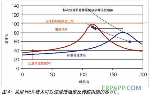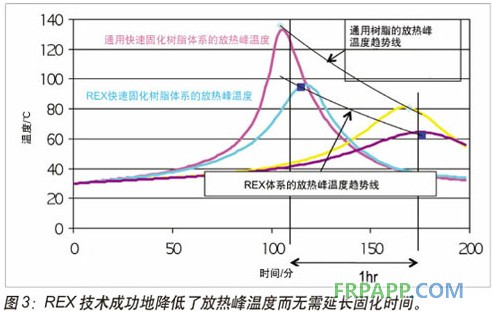 在AIRSTONE樹脂方面,陶氏化學(xué)最重要的成就是很好地處理了放熱峰溫度與反應(yīng)速度的關(guān)系。其開發(fā)的REX技術(shù)目的就是要降低固化時的放熱峰溫度(見圖2)。