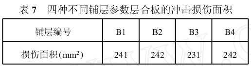 四種不同鋪層參數層合板的沖擊損傷面積見表7(沖擊能量為5.9J)。從表7可以看出,各種鋪層參數層合板的沖擊損傷面積相差無幾。這說明在其他條件都相同的情況下,鋪層參數對層合板的沖擊損傷面積影響不大。