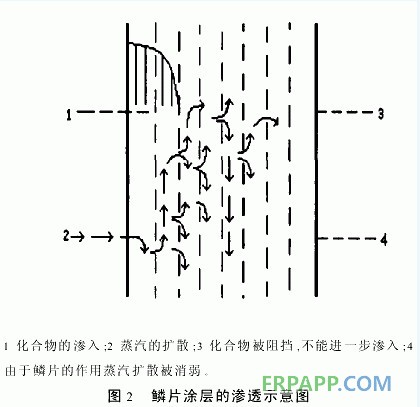 采用這種結構設計,環境中的化合物或蒸汽向金屬基體的擴散能很好地被施加的玻璃鋼防腐蝕層所阻擋。圖2所示為鱗片涂層中物質的滲透示意圖。