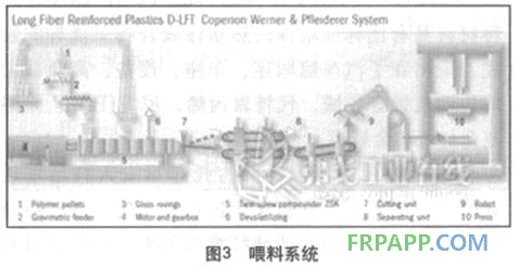 目前市場(chǎng)上主要有3種有影響的工藝,即E—LFRT,D—LFRT和S—LFRT工藝。E—LFRT是同步合成和直接擠出成型或成片;D—LFRT是同步合成和直接擠壓成型;S—LFRT是同步合成和直接注塑成型。這三種主要工藝都要求使用重量式連續(xù)喂料,將物料連續(xù)精確地喂入擠出機(jī)內(nèi)。LFRT工藝中使用的無論是單螺桿擠出機(jī)還是雙螺桿擠出機(jī),都具有獨(dú)特的螺桿設(shè)計(jì)。