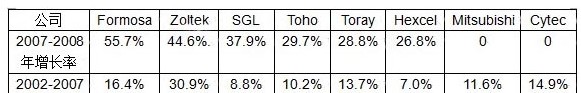 表1. 世界主要碳纖維廠產能平均年增長率統計〔2〕
