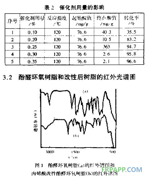 圖 1中 (a)是 酚醛 環(huán) 氧樹 脂 的紅 外 潛 圖 910era 處是環(huán)氧基的特征吸收峰,1030cm 是醚瞧 的吸收峰。圖 1中(b)是丙烯酸政性后樹脂的潛圖。 在 1705cm 附近是酚醛環(huán)氧丙烯酸酯的羰基吸收峰 1640cm 處是雙鍵 的特征吸收峰。由于丙烯酸僅與部分酚 醛環(huán)氧基發(fā) 生開環(huán)反應 ,故 9lOom 處環(huán)氧基特征吸收峰并沒有消失,3450em 附近開環(huán)生成的羥基吸收帶加寬。