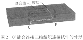 縫合連接三維編織技術是在三維整體編織工藝的基礎上將異型形狀部分用縫合線按照一定的縫合工藝參數連接起來形成所需形狀的預制件。縫合連接三維編織物的外觀如圖2所示,其中,ED方向為0°方向;和ED垂直的方向為90°方向;AB為搭接長度。