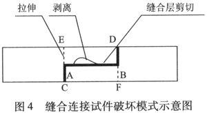 實驗表明,縫合連接在拉伸載荷作用下,出現的主要破壞模式可能有以下四種,見圖4:①接頭端部(如圖所示CE面或DF面)的拉伸破壞;②縫合區域(如圖所示AB面)剪切破壞;③接頭兩端(如圖所示CE面與DF面)同時拉伸破壞;④剝離破壞(如圖中所示搭接區域的界面發生破壞)。