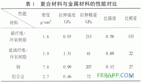 復合材料的主要特點是:性能可設計性、與構件成型的一致性,具有比強度高、比模量高、抗疲勞斷裂性能好、尺寸穩定性好等一系列優點,其綜合性能如表1所示。
