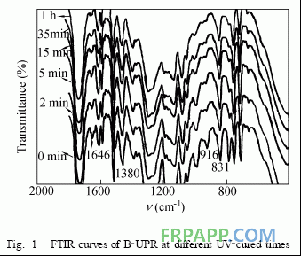 圖1是B2UPR在不同光照時(shí)間的紅外光譜圖。1647cm-1是直鏈雙鍵的特征吸收,光照2min時(shí)就迅速減小,在15min以后基本上不再變化。1380cm-1是羧基的特征峰,說(shuō)明存在少量的羧基。830cm-1譜帶是環(huán)氧樹脂段上對(duì)位取代苯環(huán)上兩個(gè)相鄰氫原子的面外彎曲振動(dòng)吸收。916cm-1是苯乙烯的雙鍵的特征吸收,在光照的最初過程中,此峰迅速減少。