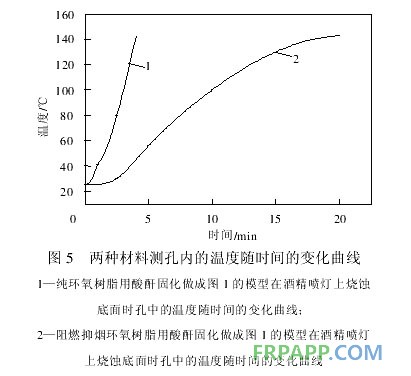 為了進一步研究加有阻燃抑煙劑聚磷酰氰胺脲的環氧樹脂燒蝕后生成的炭質泡沫層的質量,分別測定了純環氧樹脂、阻燃抑煙環氧樹脂的隔熱性能,所得曲線見圖 5。