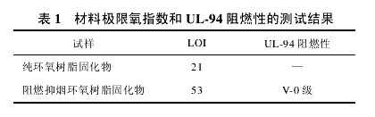 由表 1 可知,阻燃抑煙劑聚磷酰氰胺脲的加入使環氧樹脂的極限氧指數由 21 提高至 53,提高幅度達 150%,這是一般的阻燃體系所不能達到的,也未曾見過報道。