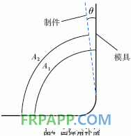 除模具的膨脹對(duì)制件固化變形有影響外,復(fù)合材料制件因?yàn)殇亴雍徒Y(jié)構(gòu)的不對(duì)稱性,以及材料本身的固化特性,在固化時(shí)產(chǎn)生內(nèi)應(yīng)力也將引起制件變形。而對(duì)于梁、長(zhǎng)桁類有大夾角的零件,固化變形最顯著的是回彈角,即制件在固化脫模后,夾角因收縮而小于模具角度,此差值為回彈角。如圖4所示,A1為模具夾角,A2為制件脫模后的夾角,θ為二者之差,即回彈角。在設(shè)計(jì)時(shí),不考慮回彈角或考慮不當(dāng),將對(duì)制件質(zhì)量產(chǎn)生較大影響,特別是對(duì)裝配的影響。