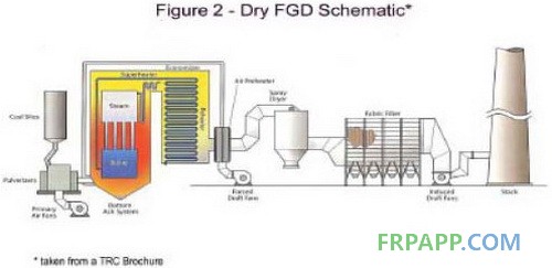 第一區域(圖1中的A區)從空氣預熱器接口開始,包括除塵器、鍋爐送風機和引風機,還有從除塵器到吸收塔入口的煙道。這一區域的煙氣含有微粒、燃燒氣體以及一些金屬氣體,其中汞是目前比較關注的污染物。對燃燒氣體中所關注的是二氧化硫、三氧化硫、氮氧化物、氯化物和二氧化碳。其中只有二氧化硫,三氧化硫和氯化物影響到抗腐蝕材料和內襯的選擇。在典型的操作條件下,煙氣溫度在300°F(149°C)至385°F(196°C)之間。有時會超過此溫度范圍,可能在一些設計或在非正常條件遇到。