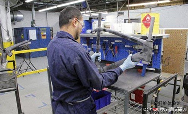 至此,所有的碳布?jí)K都被貼合到車架上了,曼紐爾用浸滿工業(yè)酒精的布料去除毛邊。在我們的參觀過程中并沒有見到這道工序,但是在噴漆前,接頭處的表面會(huì)被打磨平整,所以你才能在展示廳見到那些光滑圓潤(rùn)的車架。