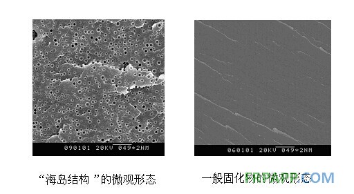 環氧樹脂合金技術(增韌技術)是大幅度提高環氧樹脂絕緣材料抗開裂性的新技術。環氧樹脂合金技術與增柔技術不同,不是將材料整體柔性化,而是將環氧樹固化物從均相材料變成非均相的多相多組分體系即環氧樹脂合金。典型的環氧樹脂合金結構是“海島結構”,見圖3-1。