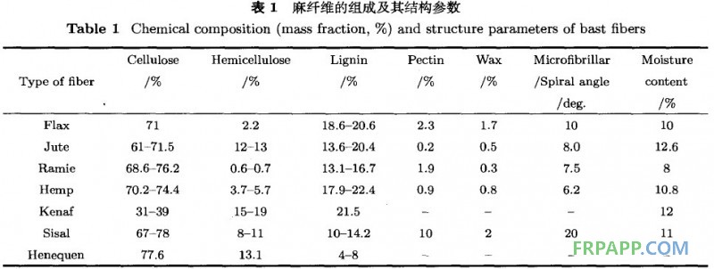 按照從其植物本體抽取部位的不同來定義區(qū)分,各類麻纖維包括一年生或多年生草本雙葉子植物皮層的韌皮纖維和單子葉植物的葉纖維.韌皮纖維主要有苧麻(Ramie)、亞麻(Flax)、黃麻(Jute)、大麻(Hemp)和洋麻(Kenaf)等;葉纖維則包括劍麻(Sisa1)和蕉麻(Abaca)等.其中黃麻和洋麻等韌皮纖維胞壁木質化,纖維短,多用于紡制繩索和包裝用麻袋等;亞麻等胞壁不木質化,纖維的粗細長短同棉纖維相近,廣泛用于紡織原料等;葉纖維則比韌皮纖維粗硬,主要用于麻繩、麻袋和手工藝品等。麻纖維具有獨特的微觀結構,表現(xiàn)出典型的復合材料特征.不同種類的麻纖維其細胞長度和寬度分布在5—50mm和20—50 m;其橫截面為有中空腔的腰圓形或多角形,縱向有橫節(jié)和豎紋.各類麻纖維主要由纖維素、半纖維素、木質素、果膠等組成,其化學成分組成和結構參數列于(表1).麻纖維因其組成和結構特點以及連續(xù)長度較長等原因,具有良好的力學性能和可加工性(表2),但是其力學性能則因其生長條件、抽取部位和種植時間不同而不同.