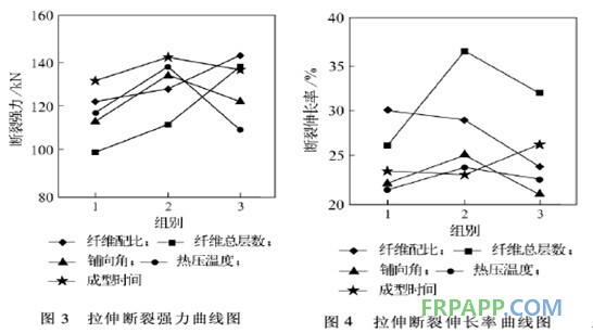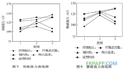 5個關鍵因素來研究,每個因素分3組(如表1所示),暫不考慮各因素間的交互作用,確定了試驗方案,測試每一組的每一因素值成品相應的拉伸、撕破、頂破性能[6],每一力學性能指標值均為某一因素值在不同組別下所測得值的平數。T字PP/型黃麻復合材料試樣的尺寸為15 cm×15 cm,厚度為0.5 cm,鋪網總層數為13、17和21層,拉伸、頂破、撕破性能測試的結果如圖3~圖6所示。在所有影響PP/黃麻復合材料力學性能的因素中,影響最大的是熱壓溫度,當熱壓溫度過高時,