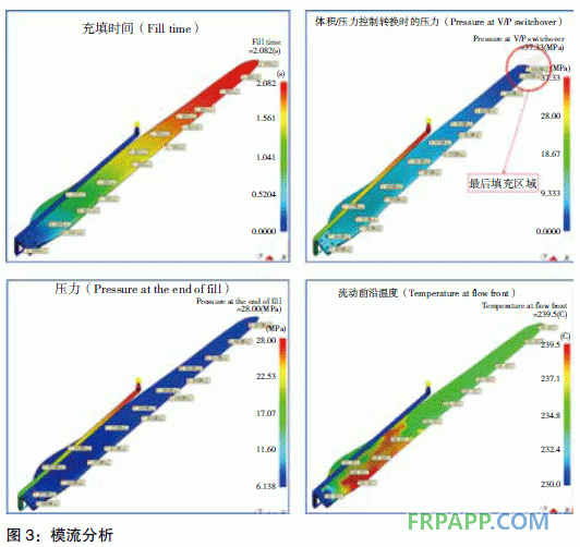 通過合理設計注塑工藝參數(shù),可以注塑生產(chǎn)出合格的熱塑性復合材料葉片產(chǎn)品,每個葉片重量為3780g,公差為±15g,完全達到葉片設計的疲勞斷裂強度要求。