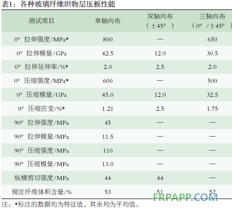 (5)層壓板力學性能。目前所用E- 玻璃纖維織物主要有單軸向布、雙軸向和三軸向布。以玻璃纖維織物為例,采用真空灌注工藝制備各種纖維織物的層壓板,按相應的ISO 標準進行測試, 葉片一般設計性能基本要求見表1。層壓板性能影響因素主要包括施加載荷相對纖維取向的偏軸角、施加載荷類型、材料局部范圍內組分材料的性能、組分材料的幾何結構以及產品內部缺陷。