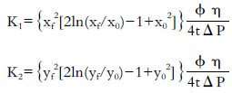 (2)二維徑向。二維徑向滲透率是指樹脂從增強材料中心一點注入,在恒定流速或恒定壓力下在面內沿徑向流動(不考慮樹脂沿厚度方向的流動),通過記錄樹脂徑向流動前鋒與時間的關系可同時得到平面內兩個主方向的滲透率,具體如下: