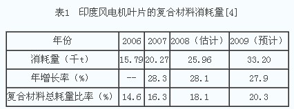 風電屬極具發(fā)展?jié)摿Αl(fā)展最快的可再生能源。“目前,世界最大風力機的輸出功率達6MW(葉輪直徑126m,葉片長61.5m)、” [1] 7 MW(GE公司)甚至10 MW(英國正在試制)。[2]風力機葉片起著將風能轉(zhuǎn)化為電能的作用,是風力機的關(guān)鍵構(gòu)件。目前,葉片一般采用環(huán)氧復(fù)合材料(碳纖維或玻纖/環(huán)氧樹脂)加工。隨著風電業(yè)的迅猛發(fā)展,葉片的復(fù)合材料[注]消耗量逐年遞增([注]:以環(huán)氧復(fù)合材料為主——筆者注):以印度風力機葉片的復(fù)合材料消耗量為例(見表1),2008年為2.596萬t, 2006~2009年的增長率約28%;“我國2007年約7萬t,年增長率約80%”[3]。隨著風力機、樹脂生產(chǎn)實踐和科技的發(fā)展,環(huán)氧復(fù)合材料除了廣泛用于加工葉片外,還加工葉片的模具和機艙罩、驅(qū)動軸,新近還出現(xiàn)了用于修復(fù)葉片的新趨勢,等等,不一而足——真可謂不可或缺、用途廣矣!