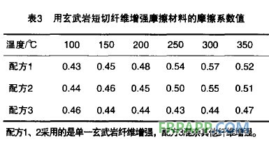 我們進(jìn)行了將試制出的玄武巖短切纖維制造摩擦材料的配方試驗(yàn)。纖維直徑9-13um,長(zhǎng)度5-10 mm,在混料過程中發(fā)現(xiàn)玄武巖短切纖維易于分散。表3為幾種配方中用玄武巖短切纖維增強(qiáng)摩擦材料的摩擦系數(shù)值。