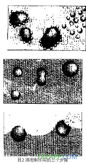 其中,V為氣泡上升速率; 為液體的粘度;r為氣泡的半徑。所以,要加快脫泡的速度,消除氣泡,除了某些機械作用如抽真空外,還可通過下列手段加以提高:(1)消除界面活性物質;(2)形成大氣泡將加速上升逸出;(3)降低液體或體系粘度。消泡荊的作用就在于能夠置換出空氣/液體(如樹脂)界面上的活性物質。它是通過如圖2所示的三個步驟來幫助提高脫泡的速度,以達到消泡的目的。
