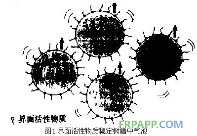 液體有以最小比表面積形成穩定態的趨勢(能量最低)。液體中夾人的氣泡是處于高能態的,就實際加工過程而言,能量的輸入和氣泡的形成是由機械攪拌、噴射等原因造成的。因此,若無其它因素影響,夾人的氣泡是能夠快速逃逸出液體的。但氣泡可通過所謂界面活性物質而穩定,這種活性物質溶于液體并具有親水和疏水的化學基團,它們在空氣/樹脂界面取向排列并通過靜電力阻止小氣泡聚結成大氣泡,如圖1所示。