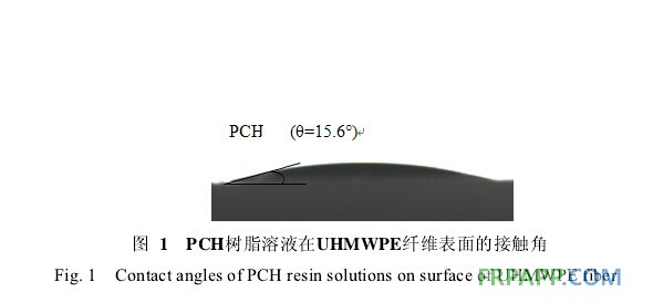 樹脂溶液對纖維表面的良好浸潤是獲得良好界面粘結(jié)性的一個(gè)重要方面,接觸角測試是經(jīng)常用來表征樹脂溶液對纖維浸潤性的方法。圖1顯示了PCH樹脂溶液在UHMWPE纖維表面的實(shí)際狀況。從圖中可以看出,PCH樹脂溶液在UHMWPE纖維表面具有較小的接觸角(θ=15.6°),這表明PCH樹脂溶液和UHMWPE纖維之間存在良好的浸潤性。