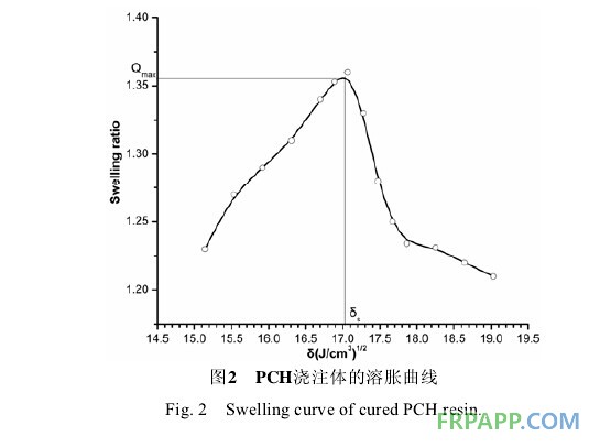 圖 2 顯示了PCH澆注體的溶脹曲線。從圖 2 可見,PCH澆注體在溶脹劑中的最大溶脹比Qmax以及對應(yīng)的溶脹劑的溶度參數(shù)δs=17.04(J/cm3)1/2。根據(jù)相似相容原理,δs可以被認(rèn)為是PCH澆注體的溶度參數(shù)值。
