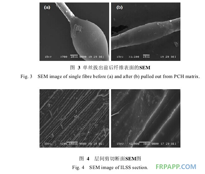 圖3顯示出了單絲拔出前后纖維表面顯微結(jié)構(gòu)的變化。通過比較圖3(a)與圖3(b),可以發(fā)現(xiàn)在單絲拔出后的纖維表面存在樹脂層,這表明在纖維和基體之間存在良好的界面結(jié)合。圖4顯示了復(fù)合材料試樣層間剪切斷面的SEM圖,從圖中可以觀察到有樹脂殘留在纖維的表面,同樣可以證明在UHMWPE纖維與PCH樹脂之間存在良好的界面結(jié)合。