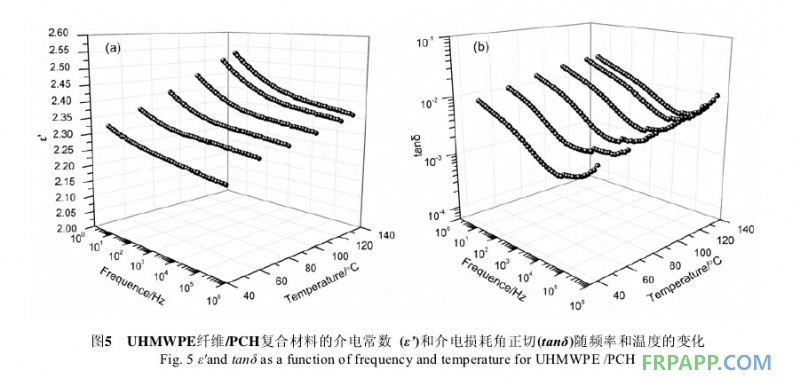 UHMWPE纖維/PCH復(fù)合材料的沖擊強(qiáng)度為141kJ/m2,復(fù)合材料優(yōu)異的抗沖擊性能源于其界面性能和基體韌性的綜合作用。圖5顯示UHMWPE纖維/PCH復(fù)合材料具有很低的介電常數(shù)值(2.20<ε’<2.53)和介電損正切值(1.50×10-3