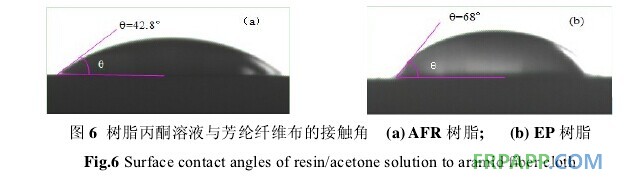 為了研究 AFR 樹脂與芳綸纖維的浸潤情況,分別測試了 AFR 樹脂丙酮溶液、EP 樹脂丙酮溶液與芳綸纖維布的接觸角(圖 6)。從圖 6 可見,AFR 樹脂丙酮溶液與芳綸纖維布的接觸角(42.8°)明顯小于 EP 樹脂溶液與芳綸纖維布的接觸角(68°),表明 AFR 樹脂溶液對芳綸纖維的潤濕性優(yōu)于EP 樹脂溶液。其主要原因是 AFR 樹脂結(jié)構(gòu)與芳綸纖維相似,兩者的表面能相近。