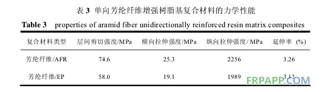 層間剪切強(qiáng)度(ILSS)可以作為從宏觀力學(xué)方面來評價(jià)復(fù)合材料界面粘接性能的主要指標(biāo)。對不同的纖維應(yīng)有與其相適應(yīng)的樹脂體系以保證樹脂對纖維具有良好的浸潤和粘結(jié)。表3列出了單向芳綸纖維增強(qiáng)不同樹脂基復(fù)合材料的ILSS。從表3可以看出,芳綸纖維增強(qiáng)AFR樹脂基復(fù)合材料的ILSS為74.6MPa,比芳綸纖維增強(qiáng)EP基復(fù)合材料的ILSS提高了28.7%。