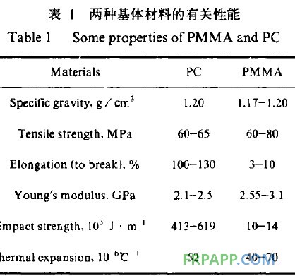 實驗選用兩種有代表性的熱塑性有機高分子材料即聚甲基丙烯酸甲酯(PMMA)和聚碳酸酯(PC)作為基體。它們均為無定形透明聚合物,具有相近的強度和彈性模量,但兩者的斷裂行為相差很大,PMMA為典型脆性斷裂,斷裂韌性約為1.5MPa.m1/2,PC具有兩種斷裂模式,脆性斷裂時其斷裂韌性約為2MPa.ml/2,韌性斷裂時其韌性高達9MPa.ml/2。表1示出兩種基體材料的有關性能。