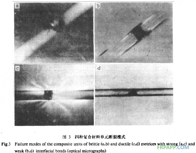 前面提到本研究采用兩種強度、彈性模量均相近但斷裂韌性及斷裂行為不同的基體材料,其一仁要目的就是研究不韌性的基體材料的復合效果及其破壞形式的差別。對于達到臨界狀態的復合材料單元來說,不同的破壞起源及不同的破壞形式是由于基體和纖維的性能以及基體和纖維問界面的性質所決定的。利用光學顯微鏡,可以分別觀察到脆性基體和韌性基體在界面強度較高(有耦聯劑)和界面強度較低(無耦聯劑)的情況下復合材料單元的四種破壞形式,如圖3所示。當界面強度弱時,復合材料單元的纖維與基體通過界面破壞來調節其纖維與基體應變的不匹配,纖維的破壞對基體的影響很小,凡基體的脆性和韌性對破壞形式影響較小,此時無論是脆性基體還是韌性基體纖維破壞局部無顯著的差異。然而當采用耦聯劑使界面強度提高時,脆性即PMMA基體在纖維斷裂的附近由丁纖維裂紋擴艘口{起的局部應力集中而發生開裂,而韌性即PC蔟體在裂紋開裂時發生形變,纖維裂紋不繼續向基體擴展。這樣脆性基體復合材料在界面強度較高的情況下會發生很多裂紋,這些裂紋在基體巾相瓦作用便會導致材料破壞;而韌性基體則先通過基體變形以調節局部應變和應力分布,最終由于材料所受應力超出其強度極限而發生斷裂。