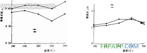 在工作溫度低于250℃時,碳纖維復合摩阻材料的摩擦系數較高,且穩定在0.32~0.44 之間,在此溫度范圍之內磨損率變化也很小。