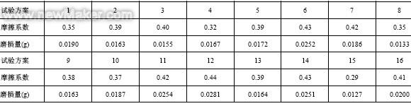 實驗材料系用碳纖維作增強纖維,改性酚醛樹脂作粘接劑并輔有各種性能調節劑與填料的多元組分體系。在材料成分配方設計中,采用了L16(45)正交優化設計方法,并經多輪實驗后,確定了碳纖維復合摩阻材料的經濟實用型配方(見表1):