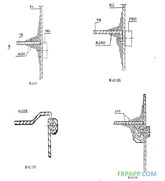 (7)帽型骨材現場糊制無肘板角連接的方式,見圖A3.3(5)所示去除甲板后,其節點連接如圖A3.3(6)所示。