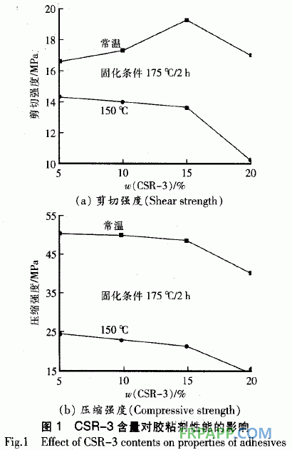 在其他條件保持不變的前提下,CSR一3含量對低密度糊狀膠粘劑剪切強度和壓縮強度的影響如圖1所示。